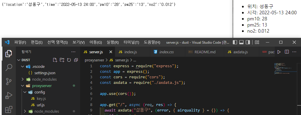 서버의 포트는 8000으로 설정하고 클라이언트의 App.js에서 axios를 이용해 공공데이터의 api가 아닌 나의 프록시서버로부터 데이터를 받는다. 이렇게 함으로서 cors문제를 해결할 수 있었다.