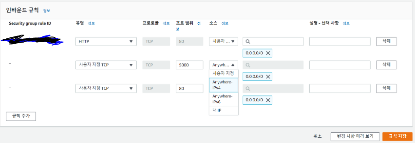 - 두 가지 포트를 추가해봅니다. Anywhere-IPv4 를 클릭해주세요!