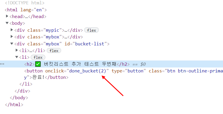 - 우리가 웹에서 기록해 html이 새로 만들어질때 적히게 되므로 우리가 만든 곳에 done_bucket을 onclick이벤트로 넣어야 한다.