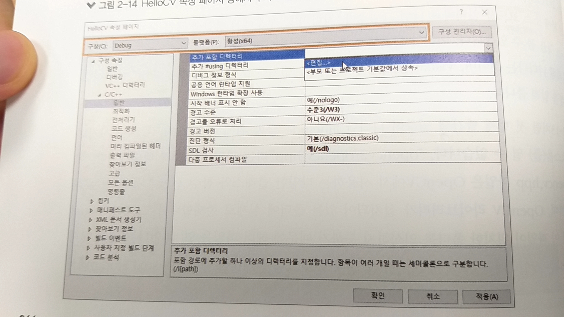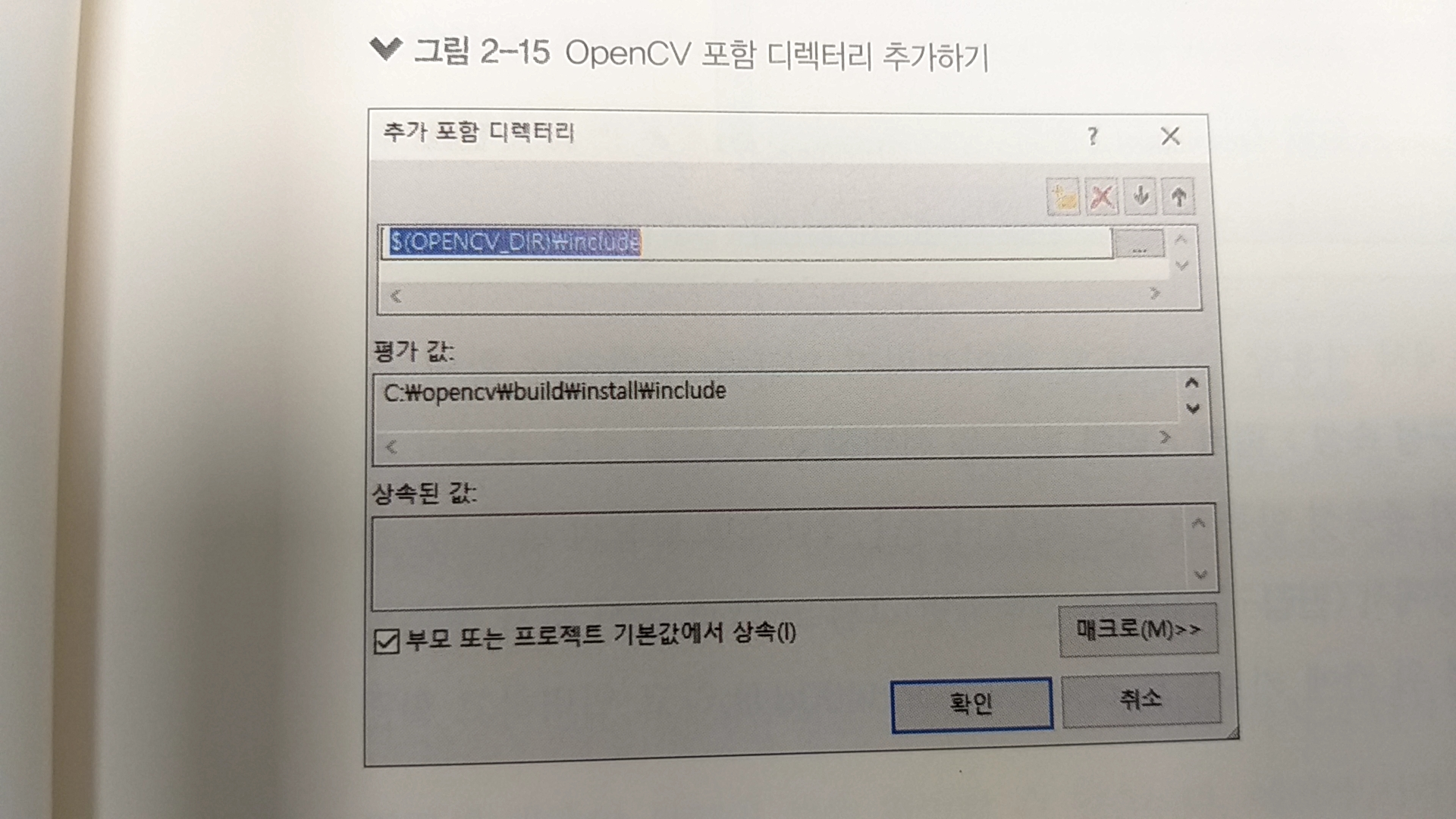 우선 일반의 추가 포함 디렉터리에서 편집을 눌러 $(OPENCV_DIR)\include 를 추가하고