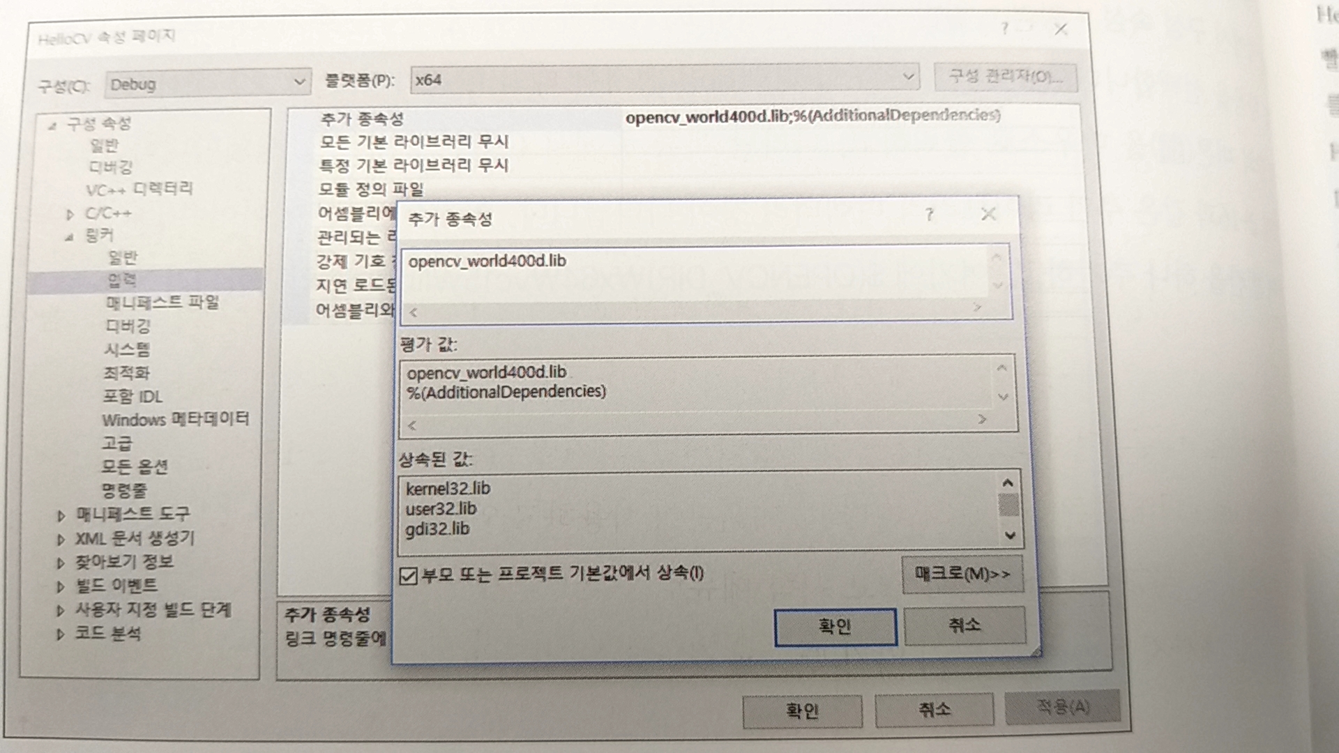 opencv_world{자신의 버전입력}d.lib 라고 입력하고 확인 버튼을 누릅니다.