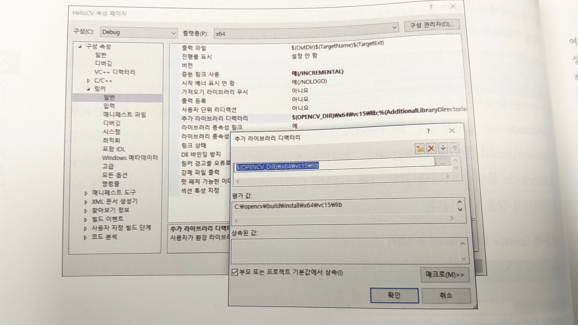 여기에는 $(OPENCV_DIR)\x64\vc15\lib 라고 입력합니다.