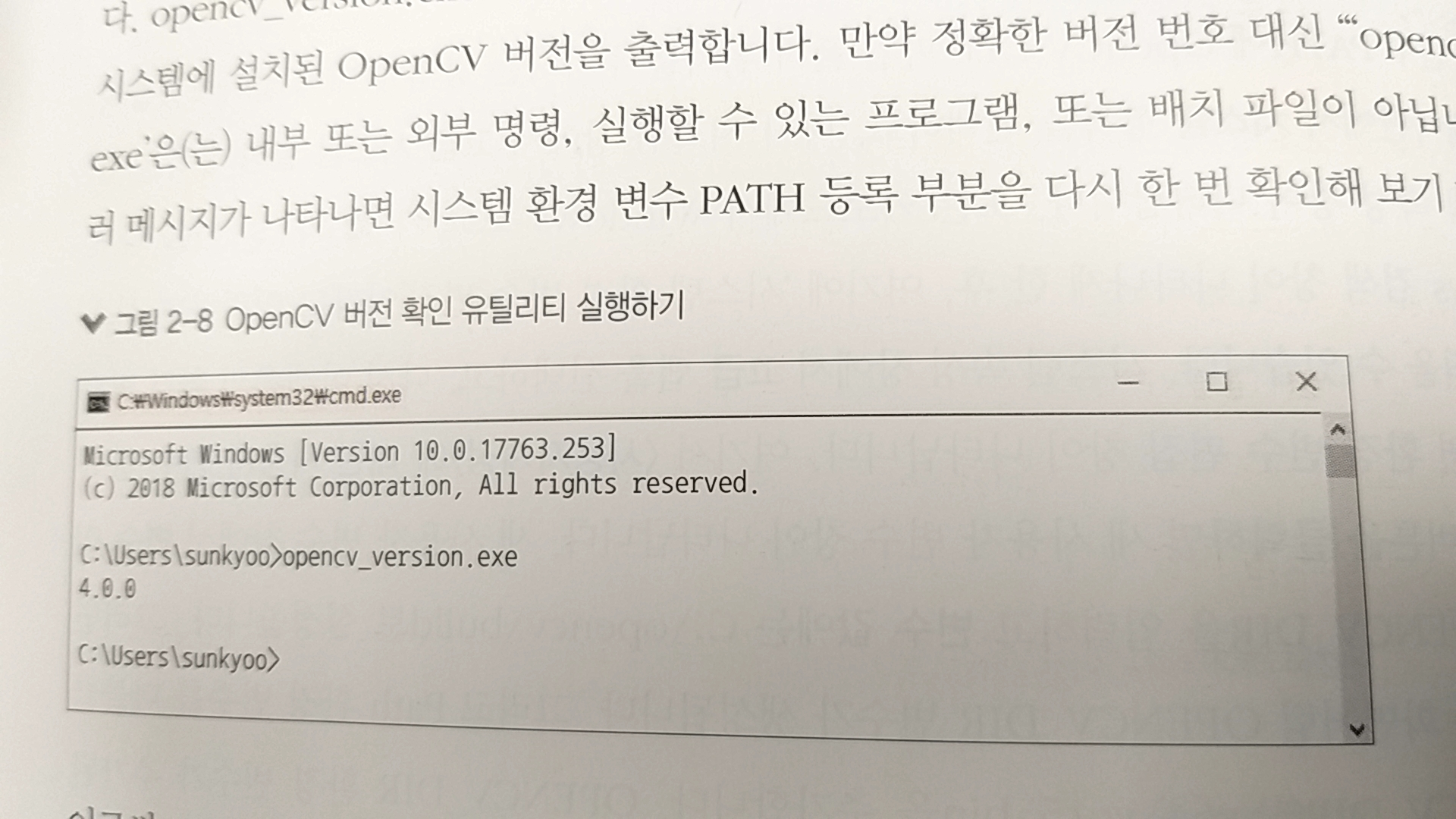 그 후에 cmd 창에 opencv_version.exe. 를 입력하면 자신의 opencv버전이 잘 뜹니다.