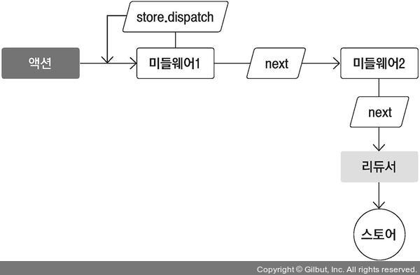 - 아니면 특정 액션에 기반하여 새로운 액션을 여러 번 디스패치할 수도 있죠.