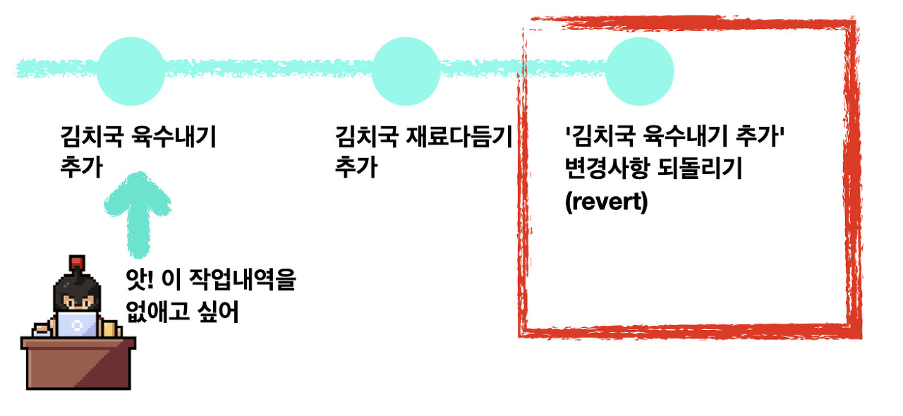 - 다른 사람들과 같이 협업하고 있다면 어떤 내용이 되돌려졌는지 기록으로 남기는 것도 중요합니다. 어떤 내용을 되돌렸는지 새로운 commit을 남기는 것을 revert(리버트) 라고 합니다. 최신 commit 뿐만 아니라 이전에 했던 commit 도 revert 로 되돌릴 수 있답니다!