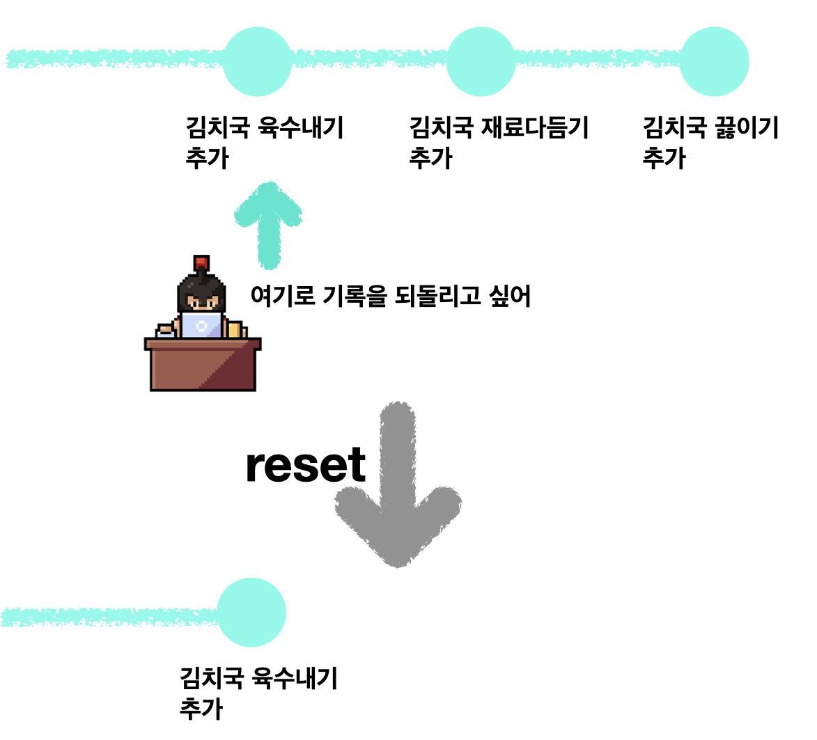 - **reset (리셋)**은 commit 했던 작업내역을 말 그대로 리셋시키는 것입니다.