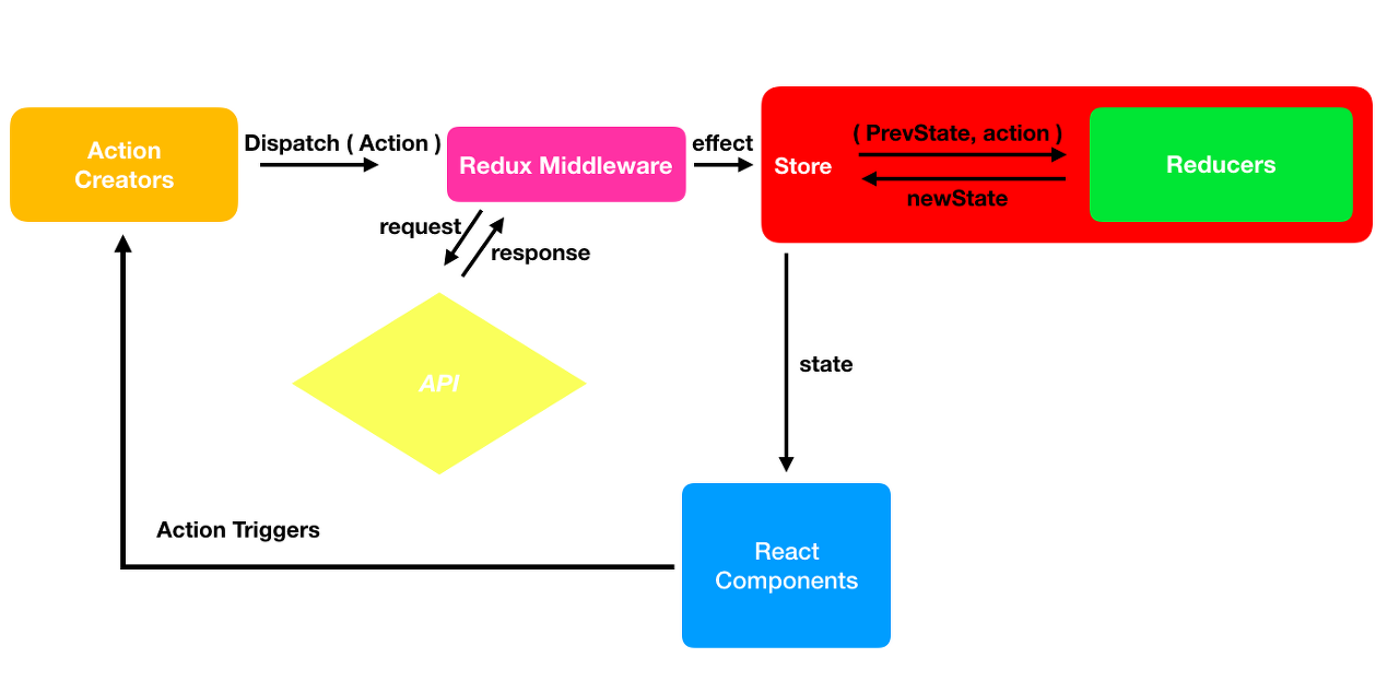 비동기 작업을 해주는 미들웨어가 추가됐을 때의 리덕스의 workflow는 아래와 같습니다.