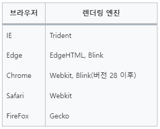 - 파이어폭스는 게코(Gecko), 사파리는 웹킷(Webkit), 크롬의 경우 웹킷을 사용하다가 웹킷을 Fork하여 블링크 엔진을 자체적으로 구현하여 사용합니다.