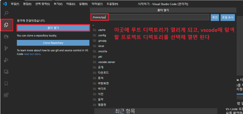 - 말그대로 putty같이 vscode에서 SSH로 원격 서버에 접속한뒤 서버 폴더 트리를 뒤져 프로젝트 폴더로 들어간뒤 프로젝트 디렉토리를 vscode로 열어 코딩하는 것이다. (vscode가 어디서든 실행되는 세상인데 적극 활용해보자)