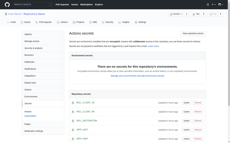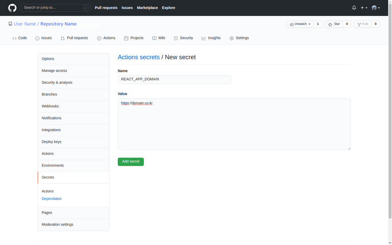 - Github Repository의 Actions Secrets은 환경 변수를 암호화해서 저장할 수 있는 기능입니다.