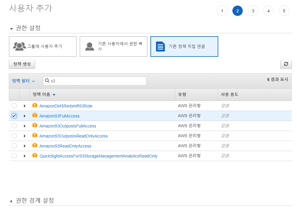 - S3를 검색하고 Full Access 권한을 부여한다.