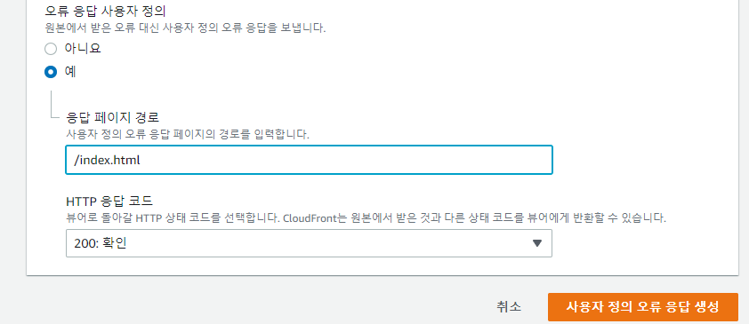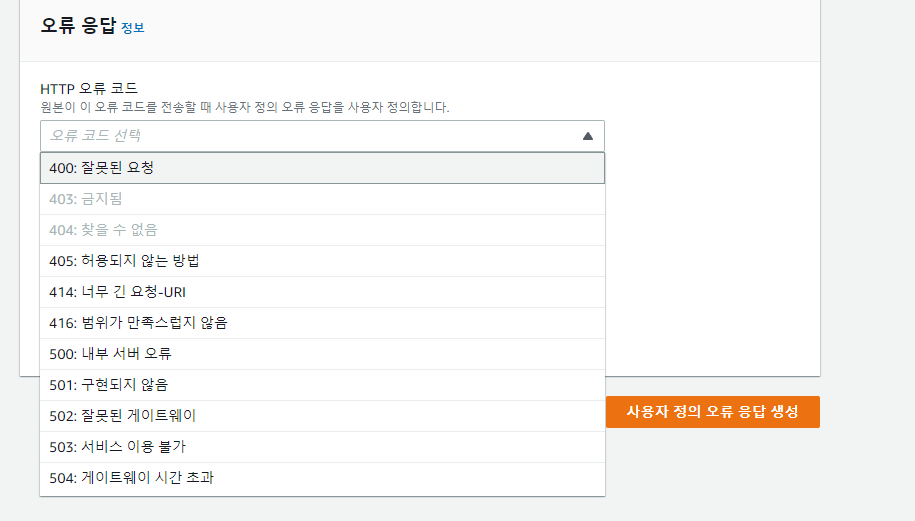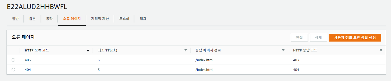 - 오류 페이지 탭에 들어갑니다 사용자 정의 오류 응답 생성을 눌러줍시다