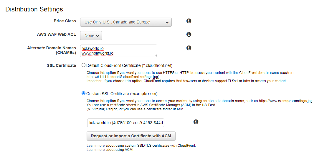 - SSL Certificate - Custom SSL Certificate를 선택하면 ACM에서 설정한 인증서를 불러올 수 있습니다.