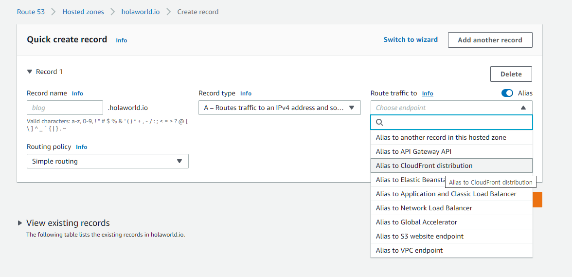 - 따라서 두 개 모두 A 레코드로 CloudFront 배포를 선택하려고 하면 두 번째로 생성하는 레코드에는 해당 대상이 표시되지 않습니다.