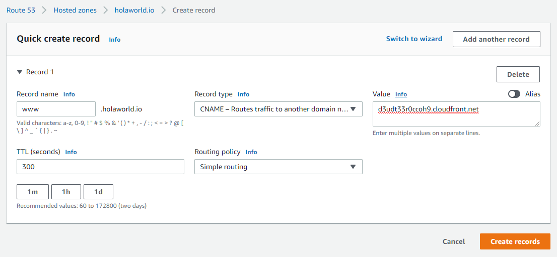 - domain.com을 A record로 alias 설정을 해 주어 www를 쓴 유저와 그렇지 않은 유저 모두 정상적으로 연결 될 수 있도록 해줄 것이다.