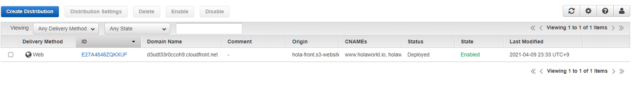 - 정상적으로 배포가 되었으면 CloudFront에서 'Enabled'된 것을 확인 할 수 있다!