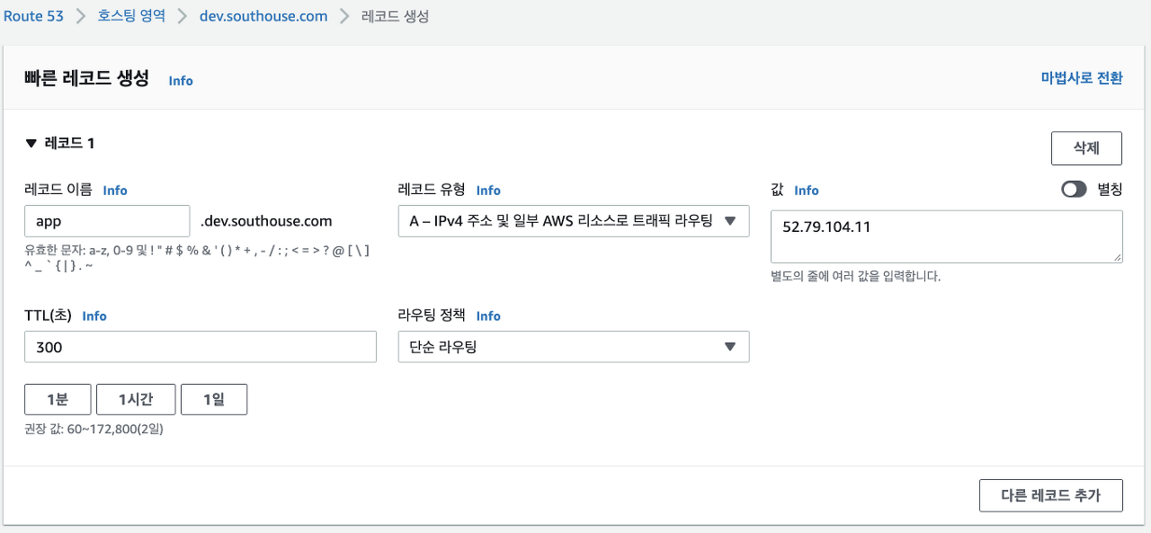 - 마지막으로, 다시 개발 계정으로 돌아와서 서비스 도메인을 등록하기 위해 A 레코드를 생성한다.