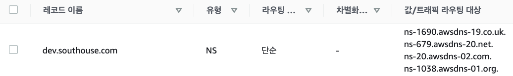 - dev.southouse.com 네임 서버에게app.dev.southouse.com 도메인을 질의한다.→ 이 때, 개발 도메인의 호스팅 영역에 접근하게 된다.