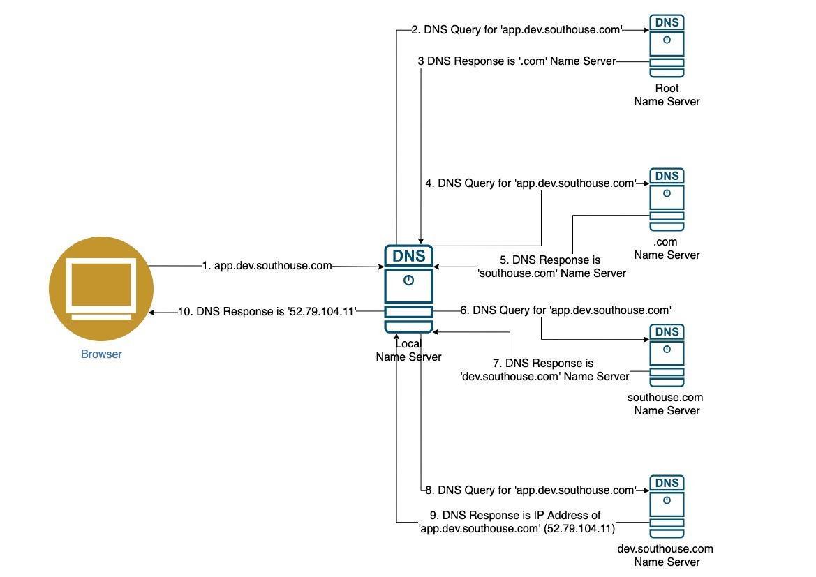 - .com 네임 서버에게 app.dev.southouse.com 도메인을 질의한다.