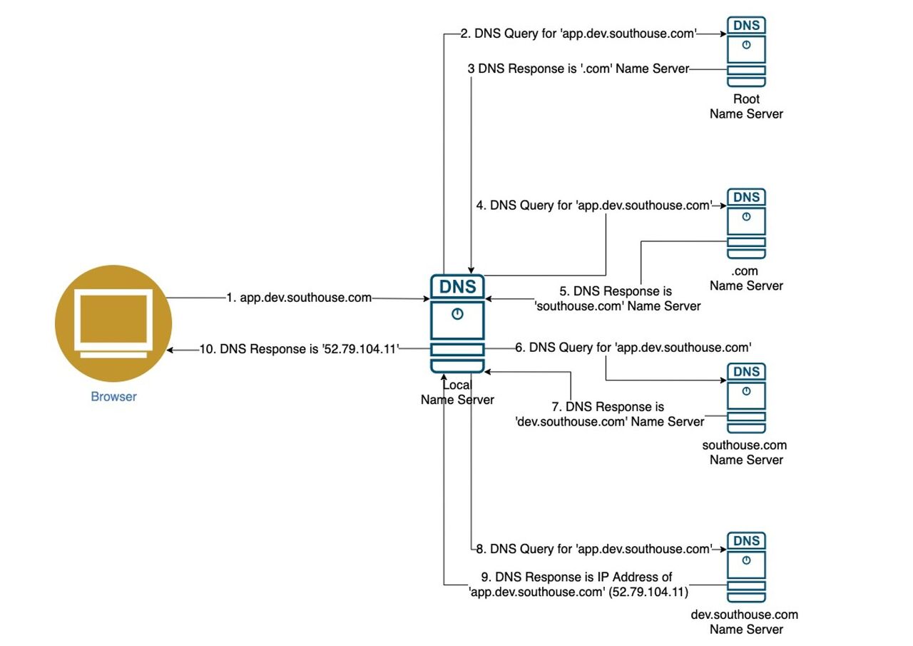 - 브라우저에서 app.dev.southouse.com 를 입력하여 접속을 시도하는데, 이때 로컬 네임 서버에 질의를 하게 된다.→ 만약, 이 때 이전에 접속했던 도메인에 경우에는 로컬 네임 서버에서 캐시 하여 정보를 갖고 있는데, 이 경우에는 로컬 네임 서버에서 바로 10번 단계로 넘어간다.