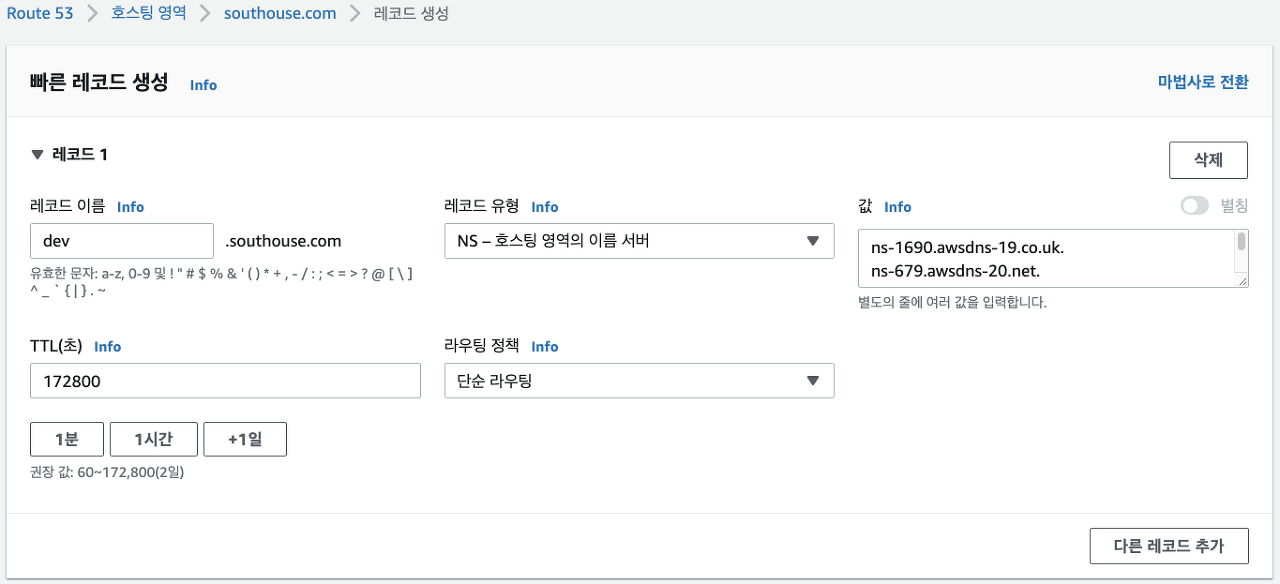 - 이제 해당 네임 서버 값을 운영 도메인의 호스팅 영역에서 개발 도메인의 이름을 가진 NS 레코드에 추가해주면 된다.