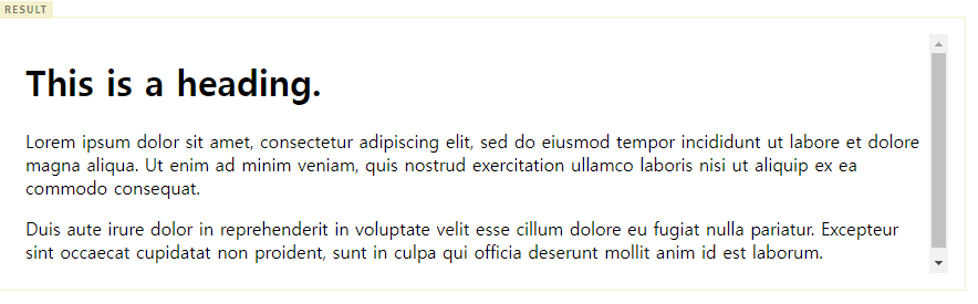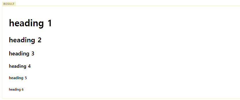 - h1이 가장 중요한 제목을 의미하며 글자의 크기도 가장 크다.