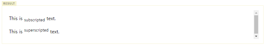 - sub 태그는 subscripted(아래에 쓰인) text를 sup 태그는 superscripted(위에 쓰인) text를 지정한다.