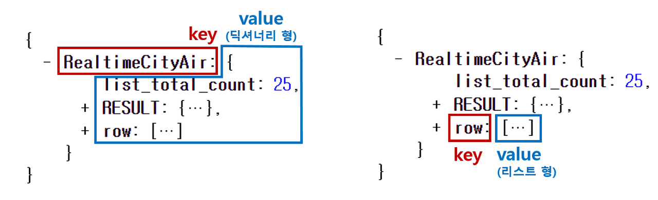 - 위 예제에서는 RealtimeCityAir라는 키 값에 딕셔너리 형 value가 들어가있고, 그 안에 row라는 키 값에는 리스트형 value가 들어가있습니다.