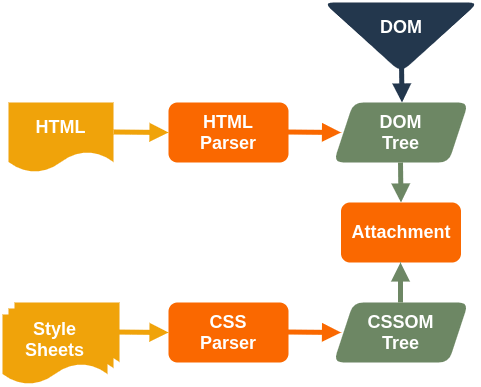 - 이때 HTML과 CSS는 단순한 텍스트이므로 각각 연산과 관리가 가능하도록 HTML Parser와 CSS Parser를 사용해 관리가 가능한 Object Model로 만듭니다.
